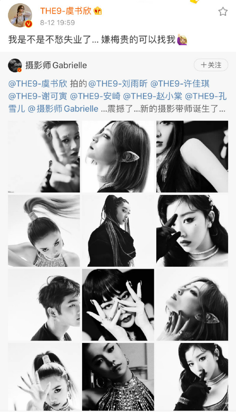來來來!來圍觀我們虞書欣的攝影技術有多好?沒錯!12號晚上,拍過很多圈內大咖,更是很多品牌御用的攝影師Gabrielle,在自己的微博曬出了一組在拍攝THE9時,虞書欣使用了自己相機拍攝的隊員黑白大片~並表示:「震撼了,新的攝影帶師誕生了…」隨後虞書欣也轉發寫道:「我是不是不愁失業了…」先來看欣欣子的作品!