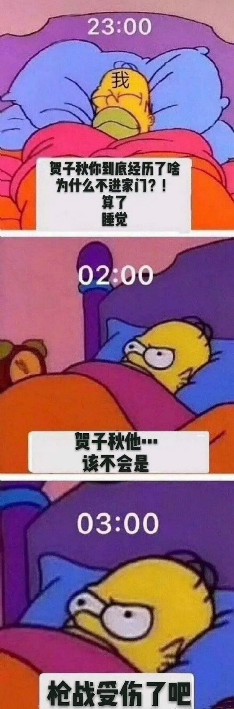 懂什麼呢??來看看小哥貼出的第一張圖~「賀子秋你到底經歷了什啥?為什麼不進家門?算了,睡覺!」、「賀子秋他…該不會是」、「槍戰受傷了吧?」哈哈哈哈哈哈哈哈哈哈哈哈哈哈哈哈哈哈哈!果然是12G衝浪的小哥啊!居然第一時間就隨大隊舞了這個梗!