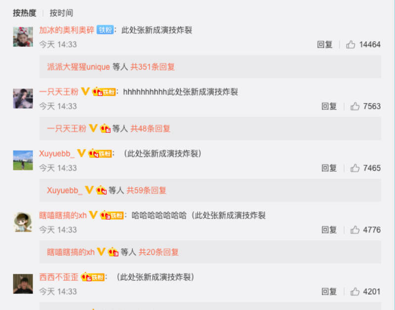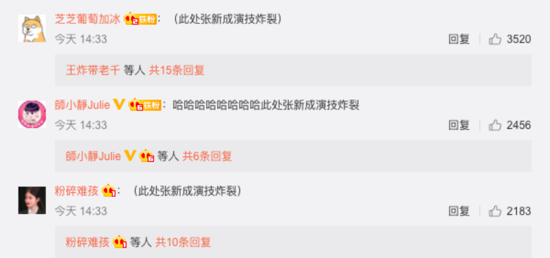 重點來啦!既然真主敢自己玩這個梗回應,粉絲怎麼會放過他呢?於是小編第一次看見熱評前10的回應這麼統一,一律打上了「此處張新成演技炸裂」!哈哈哈哈哈哈哈哈哈哈哈哈哈!