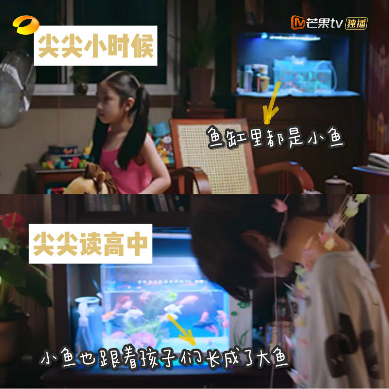 尖尖小時候,魚缸里都是小魚;尖尖讀高中時,魚缸裡的魚都變成大魚了!家裡魚缸的魚,也陪著三兄妹一起長大啦!