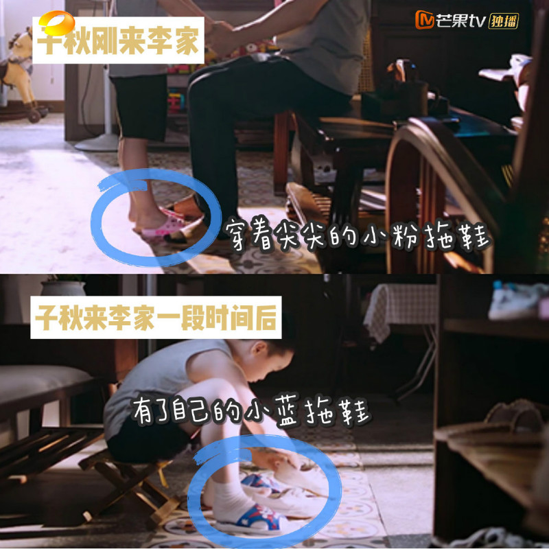 小哥剛來李家,因為沒有自己的拖鞋,所以穿著的是尖尖的小粉拖鞋,之後才有了自己的小藍拖鞋。