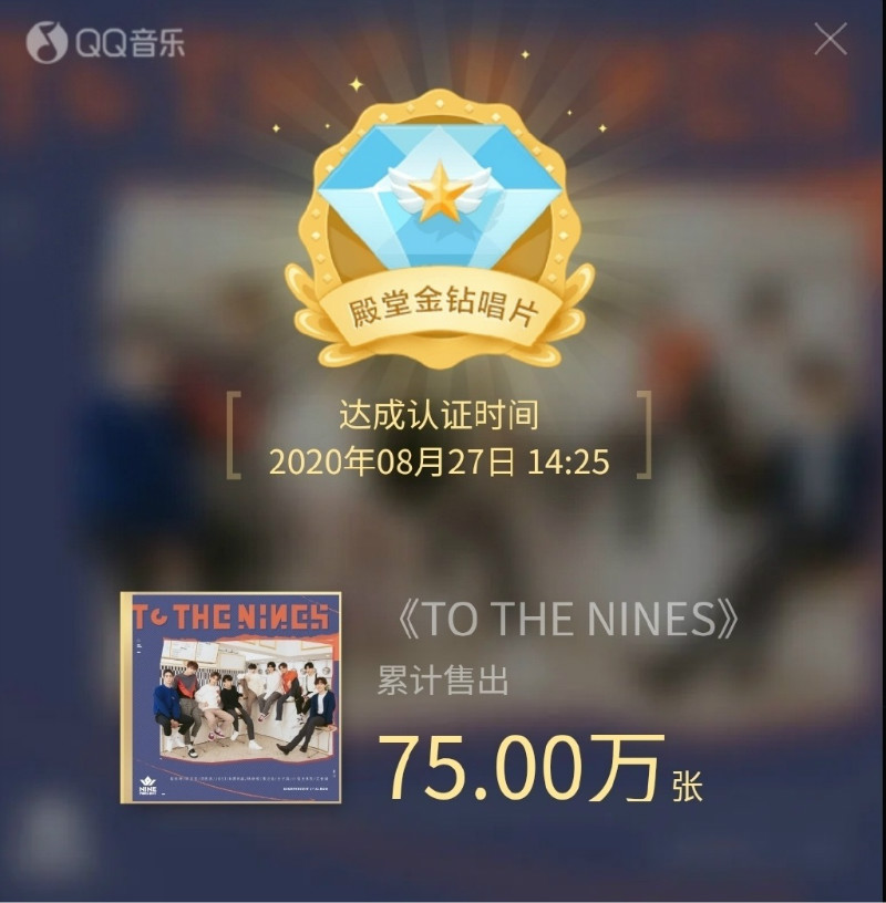 是噠!NINE PERCENT組合首張團體專輯《TO THE NINES》累計銷量,在8月27號下午2點25分,也就是推出的兩年多之後,售出75萬張,達成Q音樂殿堂金鑽唱片認證!