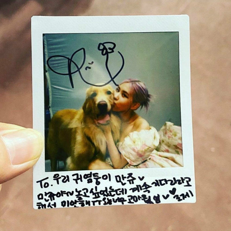 結果隨後這隻狗狗的主人,在INS上傳了自己“兒子”和ROSÉ一起拍的拍立得,沒想到原來ROSÉ還特地在拍立得上給狗狗寫了信!