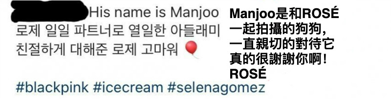 主人表示MANJOO是和ROSÉ一起拍攝的狗狗的名字,很感謝ROSÉ在拍攝期間一直很親切的對待MANJOO呢!