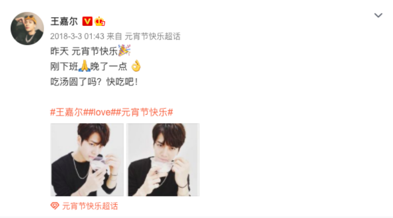 到底這條紅繩第一次出現在粉絲面前是什麼時候呢?答案是2018年的元宵節!那一天王嘉爾更新了微博,表示自己在吃元宵節湯圓!注意看,手上第一次出現了紅繩!