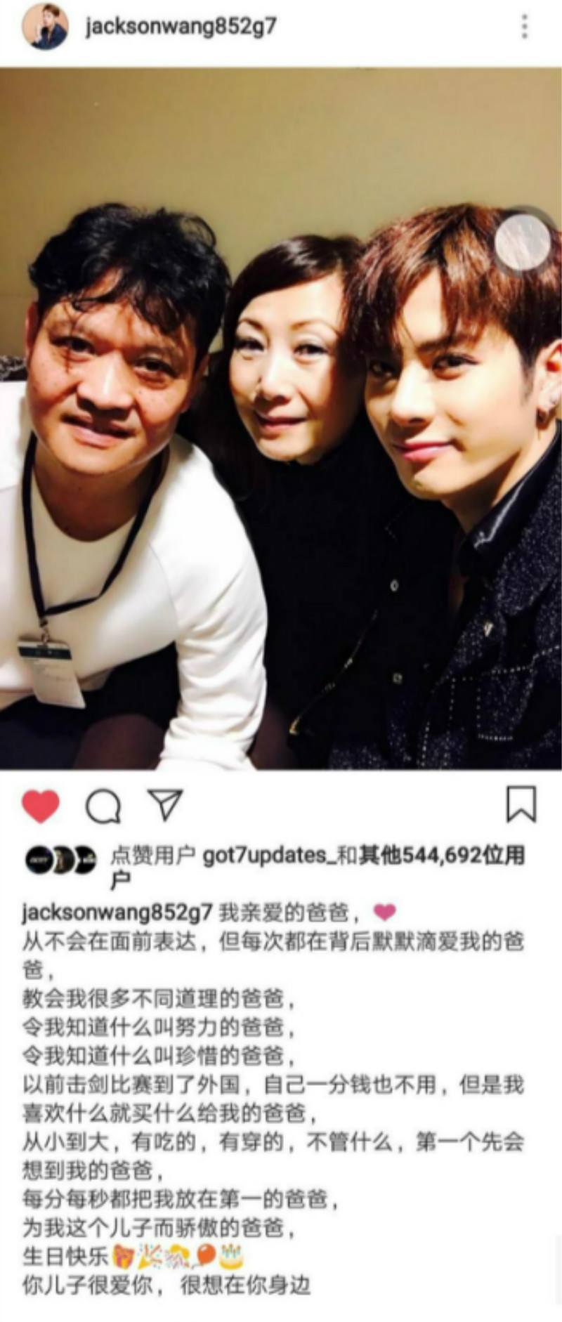 甚至在INS中也有很多有關父母的貼文!滿滿的都是他對父母的感謝和愛!不管是自己的生日、父母生日,還是父親節母親節,只要有機會他都會表達出自己對父母的愛和感恩!