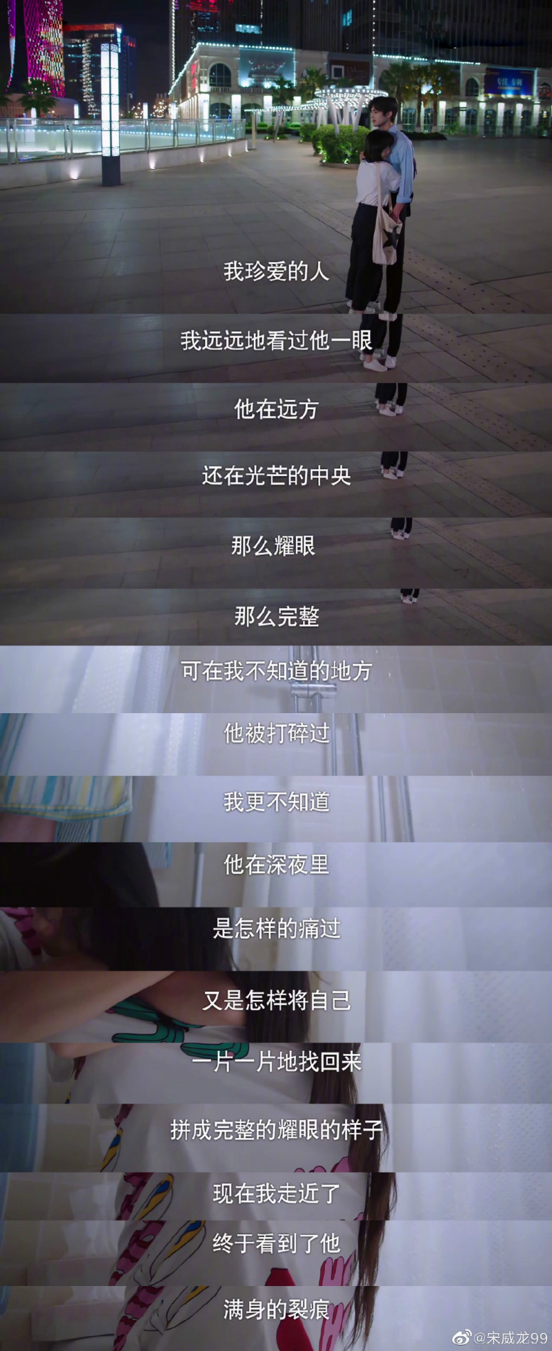 而宋威龍的配圖中,有一張是《以家人之名》中的一段台詞,就是尖尖發現凌霄生病時說的一段話:「我珍愛的人我遠遠地看過他一眼,他在遠方,還在光芒的中央那麽耀眼那麽完整,可在我不知道的地方他被打碎過,我更不知道他在深夜裡是怎麽樣的痛過,又是怎樣一片片的將自己找回來拼成完整的樣子,現在我走近了,終于看到了他滿身的裂痕。」宋威龍特別挑了這一段來分享,或許是他很喜歡的台詞吧!
