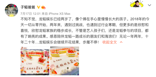 甚至黃子韬爸爸最後一條微博依然是為了兒子的公司,在這一刻看來真的分外引人淚目。在最後一條微博裡,黃子韬爸爸曬出蛋糕慶祝公司成立2周年,表示:「不知不覺,龍韬娛樂已經兩歲了,像個捧在手心裏慢慢長大的孩子。2018年的今天一切從零開始,兩年來,遇到過挑戰,也遇到過行業寒期,但更多的是欣慰和喜悅,欣慰龍韬家族的穩步成長,不管是藝人孩子們,還是龍韬參與的項目,都有了響亮的成果。感恩陪伴龍韬一路成長的朋友們和海浪們!無論一年兩年,十年二十年…龍韬娛樂會繼續開花結果,步履不停!」