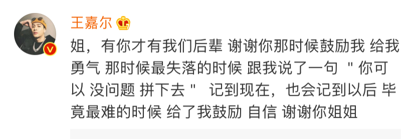 而嘎嘎也第一時間回覆了姐姐的貼文,表示:「姐,有你才有我們後輩,謝謝你那時候鼓勵我,給我勇氣,那時候最失落的時候,跟我說了一句"你可以沒問題拼下去" 記到現在,也會記到以後,畢竟最難的時候給了我鼓勵、自信,謝謝你姐姐。」