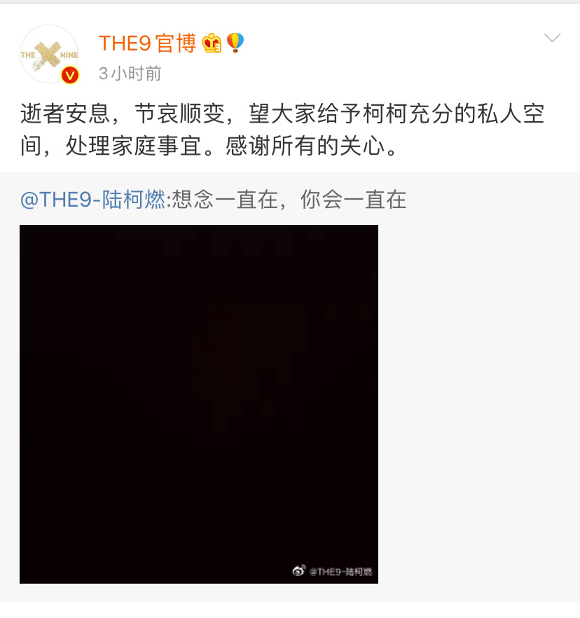 THE9官博隨後轉發寫道:「逝者安息,節哀順變,望大家給予柯柯充分的私人空間,處理家庭事宜。」