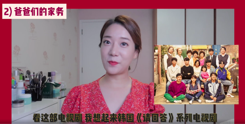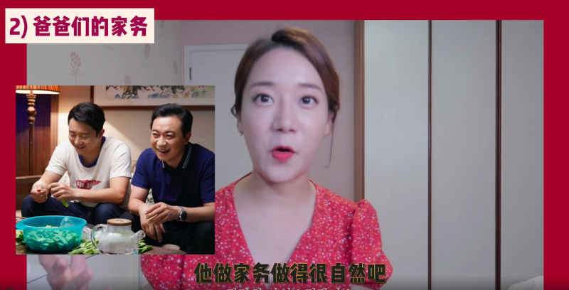 而紅紅覺得《以家人之名》和《請回答》系列最大的不同,就是在《請回答》系列中,成東日爸爸們做家務嗎?答案是NO!都是媽媽在做!但《以家》的日常裡,只有兩個爸爸的角色。紅紅表示李爸做家務做得十分自然,不但有自己的麵館,還要做飯、教孩子們,她表示在韓國綜藝上常常出現中國男人做家務的畫面,所以很多韓國女生都會好奇這是事實嗎?從《以家》來看,好像真的是事實呢!