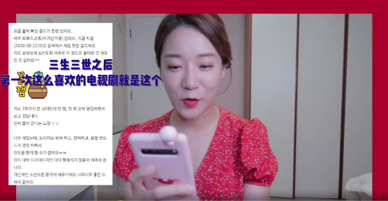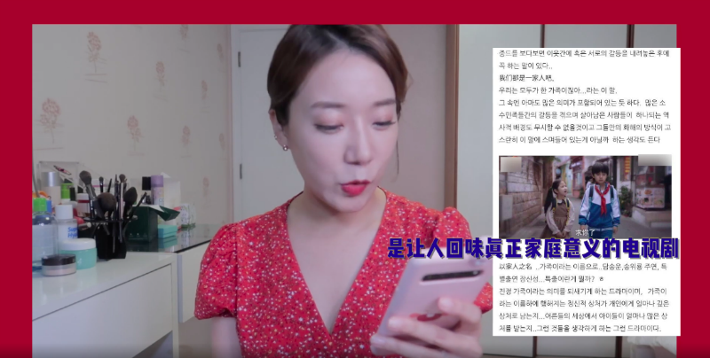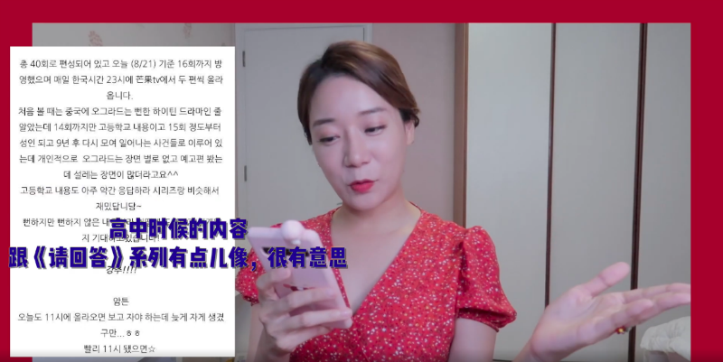 紅紅也念出韓國網友對於這部劇的看法,有網友表示「沒有尷尬的畫面,反而很多心動的場景,高中部分和《請回答》系列相同」、「是讓人回味真正家庭意義的電視劇,以家人名義下進行的精神創傷,給個人留下精神創傷」、「是續三生三世之後,第一次這麼喜歡的電視劇!」…