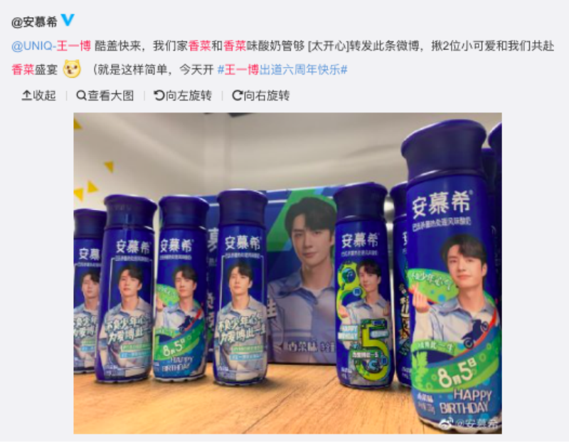 最厲害的是…因為王一博太愛吃香菜了,於是在他生日時,代言的安慕希特地為他推出了一款“安慕希香菜味酸奶”!我的天啊!!!夠神奇了吧!