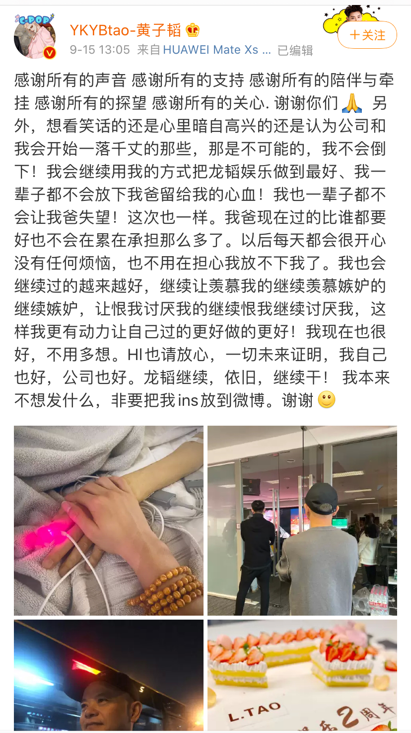 我現在也很好,不用多想。 Hl也請放心,一切未來證明,我自己也好,公司也好。 龍韜繼續,依舊,繼續幹! 我本來不想發什麼,非要把我ins放到微博。 謝謝」