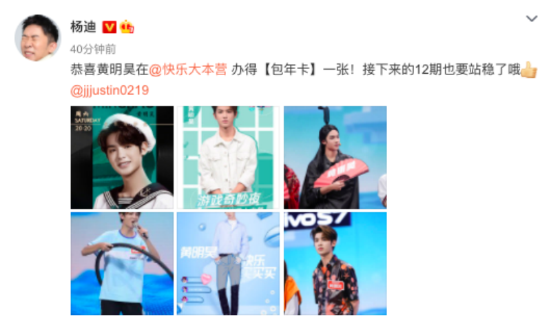 哈哈哈哈哈!是不是真的超有綜藝感??而師父楊迪也第一時間發文祝賀!表示:「恭喜黃明昊在快樂大本營獲得「包年卡」一張!接下來的12期也要站穩了哦👍」