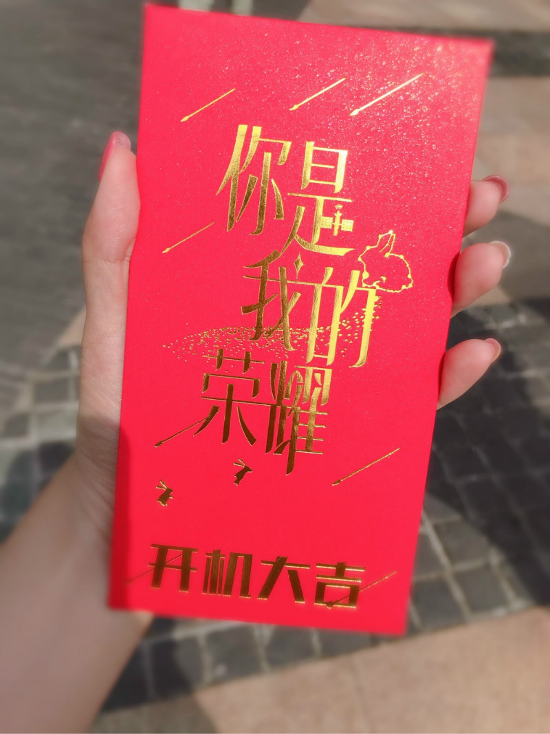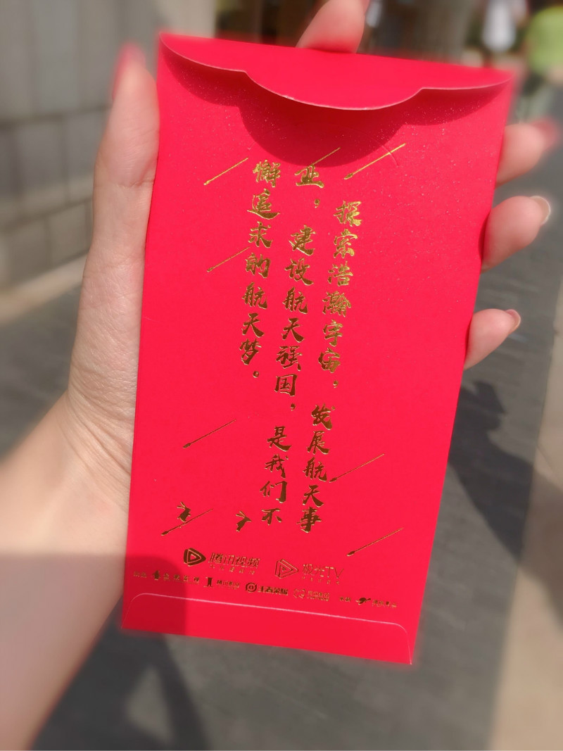 來看看劇組準備的紅包,上面除了有《你是我的榮耀》之外,背面還有「探索浩瀚宇宙,發展航天事業,建設航天強國,是我們不懈追求的航天夢」的口號!
