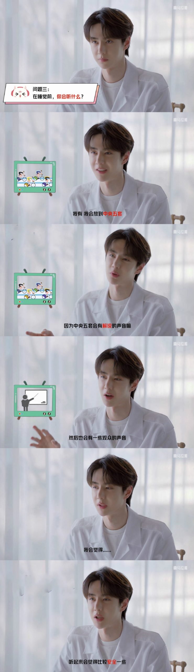 一頭霧水吧?顆顆顆~來聽聽王一博怎麼說~眾所皆知,王一博很膽小,而且怕黑,所以他不看恐怖電影,在陌生的酒店睡覺也有自己的一套法寶,那就是開著電視機轉到中央五台,然後聲量調到三號,就這麼播放著陪著他入睡~
