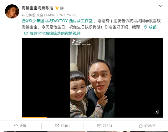 是不是模仿得超像呢?而在5號肖戰29歲生日這天,微博和抖音被一條海綿寶寶祝肖戰生日快樂的視頻刷屏,粉絲都以為是原配音老師,紛紛在評論區感謝老師!但有粉絲聽了發現這視頻應該不是原配音老師,於是就聯系了陳浩老師,沒想到在得知是戰戰生日後,老師居然表示要錄一條貨真價實的祝福!