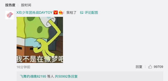 結果!!!!自從網暴事件之後,N百年沒在微博和其他人互動的肖戰,居然回複了這則貼文,表示:「我枯了!」而且配圖依然還是海綿寶寶,表示「我不是在做夢吧」