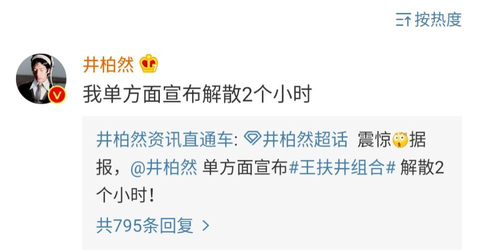 沒想到井柏然居然下場評論了這則視頻,表示:「我單方面宣布解散兩個小時」哈哈哈哈哈哈哈哈!這大概是史上最快解散又合體的組合了吧!