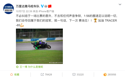 而王一博所屬YAMAHA車隊之前也發博表示:「不必糾結于一場比賽的意外,不去和任何聲音爭辯,1:56的圈速足以說明一切,我們會奪回屬于我們的冠軍,就一句話,下一次 賽場見!!🏆 加油 TRACER -85[加油] ​​​​」