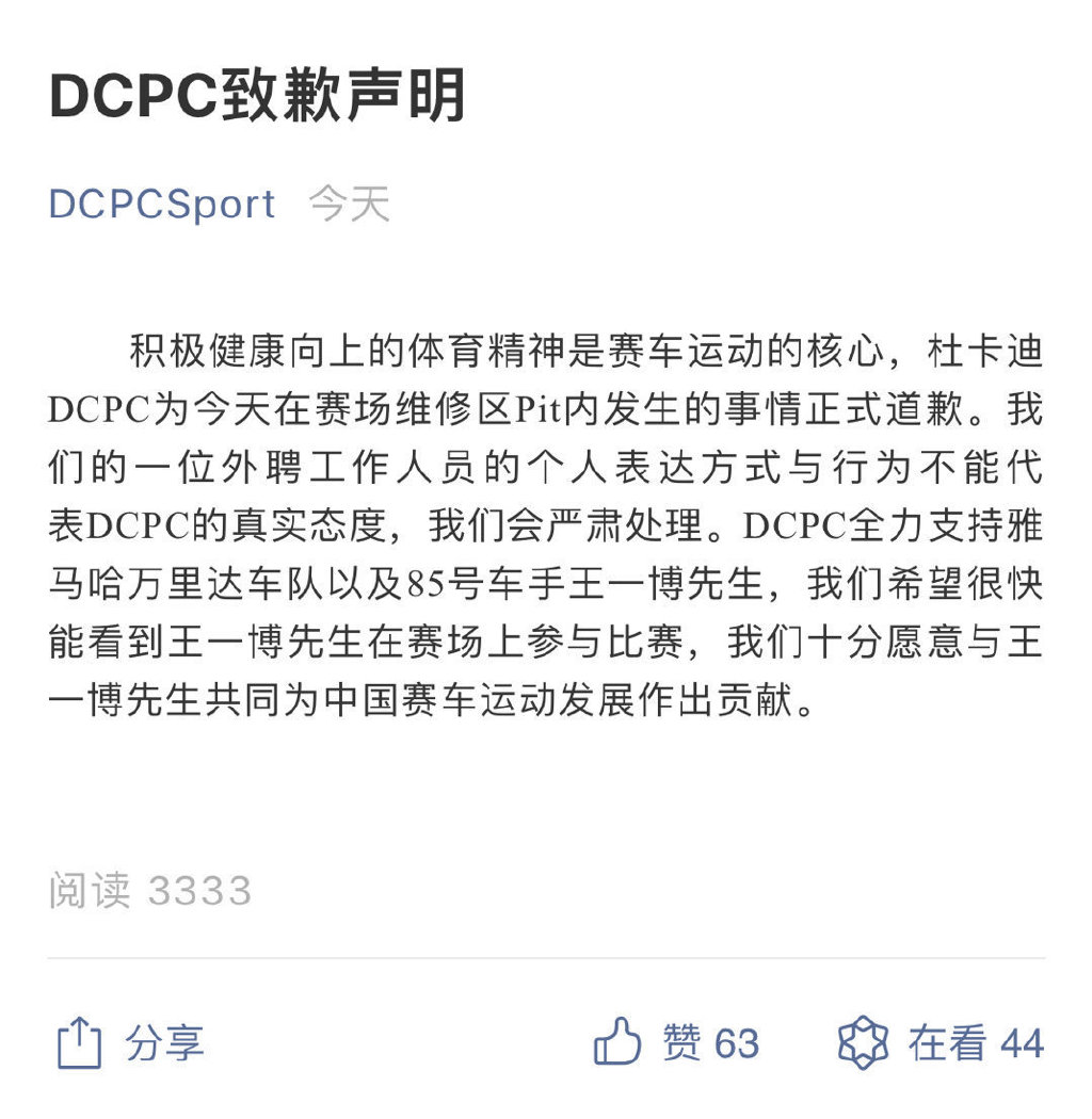由於爭議聲不斷,於是在7號深夜,中國杜卡迪車隊公眾號再次貼出道歉啟事,表示他們的一位“外聘工作人員”的個人表達方式與行為,不能代表DCPC的真實態度,會嚴肅處理。DCPC全力支持雅馬哈萬里達車隊以及85號車手王一博先生,希望很快能看到王一博在賽場上參與比賽,也十分願意與王一博共同為中國賽車運動發展作出貢獻。