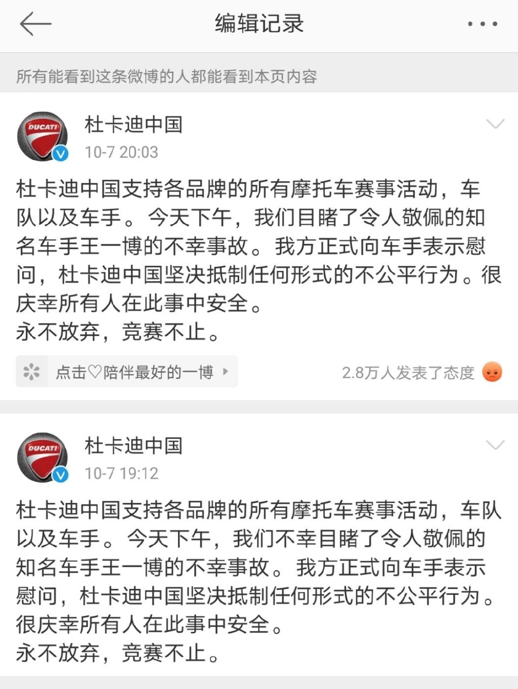 而中國杜卡迪車隊在7號晚上也發文致歉,表示:「杜卡迪中國支持各品牌的所有摩托車賽事活動,車隊以及車手。 今天下午,我們目睹了令人敬佩的知名車手王一博的不幸事故。 我方正式向車手表示慰問,杜卡迪中國堅決抵制任何形式的不公平行為。很慶幸所有人在此事中安全。永不放棄,競賽不止。 ​​​​」但其實這是第2版本,在第一版本中,杜卡迪多次使用「不幸」字眼,不少網友評擊道歉毫無誠意。