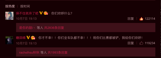 而熱評第一獲得了高達12萬點讚的,僅僅只有6個字,就是:「你們歡呼什麼?」這句話和王一博同車隊的尹正所發的一樣,尹正雖然獲得了B5組小組冠軍,但是他事後發博,也只發了這7個字,並拒絕了所有祝賀!王一博摔車敵隊全體歡呼!尹正&王一博車隊都發博了!內附視頻!