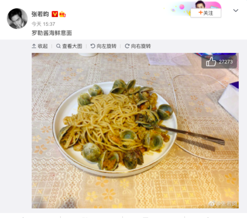 結果沒想到才秀了自己的“小蠻腰”,12號下午張若昀又發文曬美食,表示自己吃了:「羅勒醬海鮮意面 !」嗚嗚嗚~看起來真的好好吃哦!而且…哥,你真的不感覺自己在拉仇恨嗎???