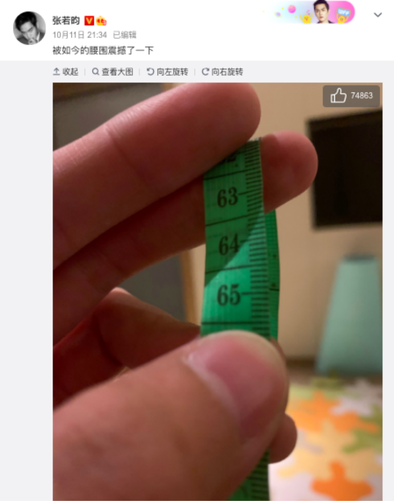 不過更讓人“氣憤”的後續來啦!11日張若昀在微博分享了自己最新的腰圍數據,曬出的軟皮尺上顯示只有65厘米!!!!WHAT!也就是不足26寸!!!他感慨道:「被如今的腰圍震撼了一下。」哥~不只你震撼,很多人都震撼了啊!!!!