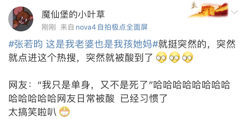 「就挺突然的,突然點進這個熱搜,突然就被酸到了!網友:”我只是單身,又不是死了”哈哈哈哈哈哈哈哈哈哈哈哈網友日常被酸,已經習慣了」