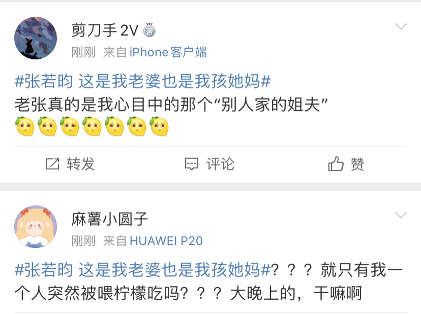 「老張真的是我心目中的那個”別人家的姐夫”」、「就只有我一個人突然被喂檸檬吃嗎?大晚上的,幹嘛啊」