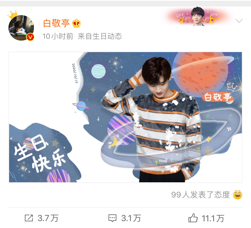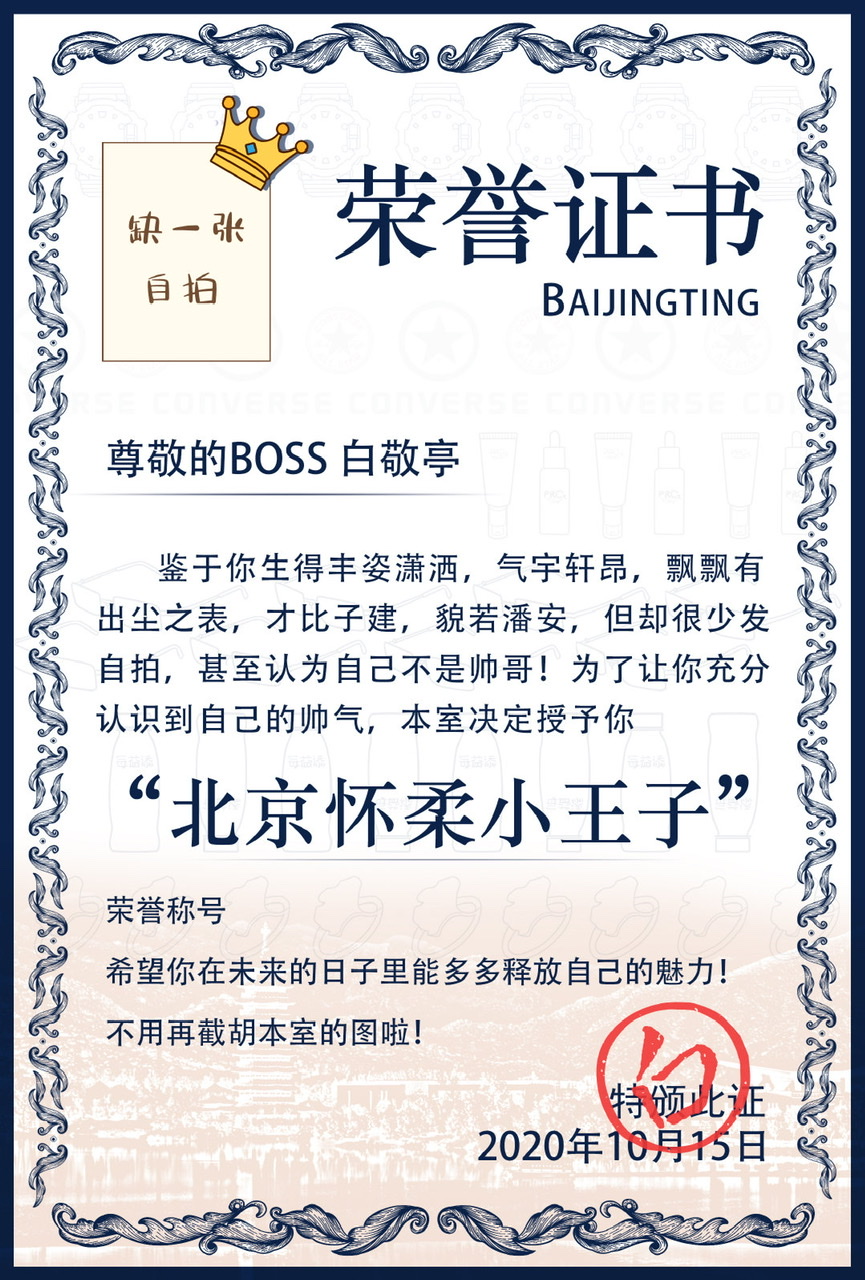 另外表示有沙雕主子就有沙雕工作室!白敬亭工作室也發文祝賀:「雖然王子不需要證明,但也要走個形式! 在今天這個美好的日子裡,特頒此證,以釣自拍。」