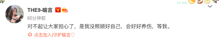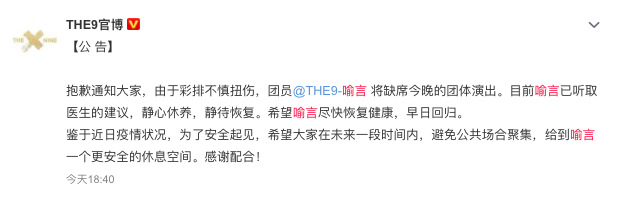 THE9官博在16號傍晚發文,表示成員喻言因為扭傷,即將缺席今晚的團體舞台表演。全文如下:「抱歉通知大家,由于彩排不慎扭傷,團員@THE9-喻言將缺席今晚的團體演出。目前喻言已聽取醫生的建議,靜心休養,靜待恢複。希望喻言盡快恢複健康,早日回歸。鑒于近日疫情狀況,為了安全起見,希望大家在未來一段時間內,避免公共場合聚集,給到喻言一個更安全的休息空間。感謝配合! 」
