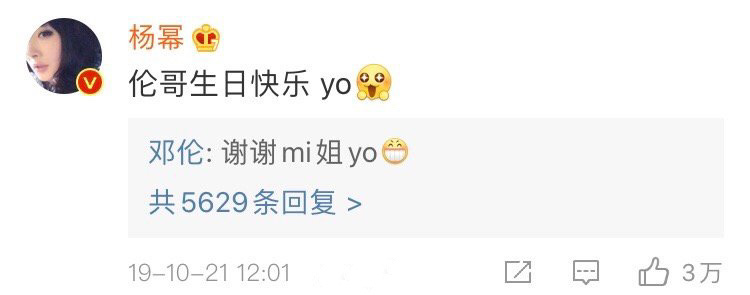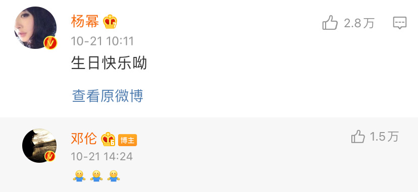 不過現在熱評第一、第二的評論都不是粉絲,而是和鄧倫合作過的楊冪和馬思純!熱評第一的大冪冪留言:「生日快樂喲」而倫哥也回覆了三個抱抱的表情符號。