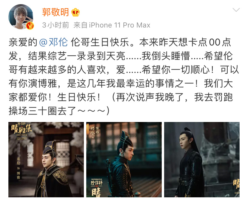除了楊冪和馬思純,鄧倫第一部電影《陰陽師之晴雅集》的電影導演郭敬明也發文啦!「親愛的倫哥生日快樂。 本來昨天想卡點00點發,結果綜藝一錄錄到天亮……我倒頭睡懵…..希望倫哥有越來越多的人喜歡,愛…… 希望你一切順心! 可以有你演博雅,是這幾年我最幸運的事情之一! 我們大家都愛你! 生日快樂! (再次說聲我晚了,我去罰跑操場三十圈去了~~~)」