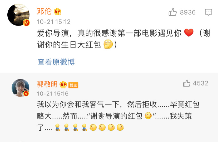 而倫倫子也回覆表示:「愛你導演,真的很感謝第一部電影遇見你[心](謝謝你的生日大紅包[偷笑])」但郭敬明的回覆也是超爆笑,導演回覆表示:「我以為你會和我客氣一下,然後拒收……畢竟紅包略大…..然而…..“謝謝導演的紅包[笑而不語]”.. …..我失策了….[跪了][跪了][跪了][跪了][左哼哼][左哼哼][右哼哼][右哼哼]」哈哈哈!這兩人互動果然從來不會讓我們失望啊!