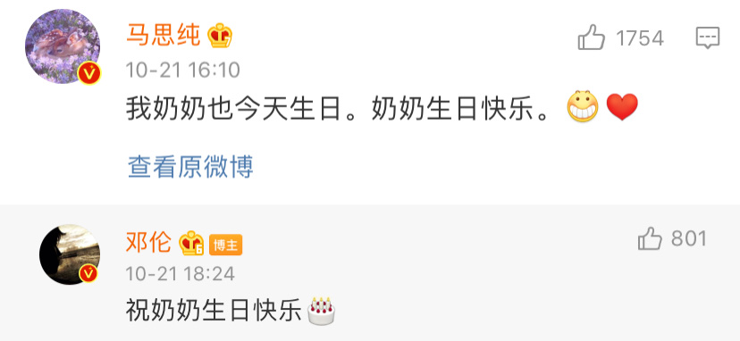 而和鄧倫一起合作過《加油你是最棒的》馬思純也送祝福,不過可愛的她表示:「我奶奶也今天生日。奶奶生日快樂。」鄧倫也回覆:「祝奶奶生日快樂。」居然這麼巧啊?