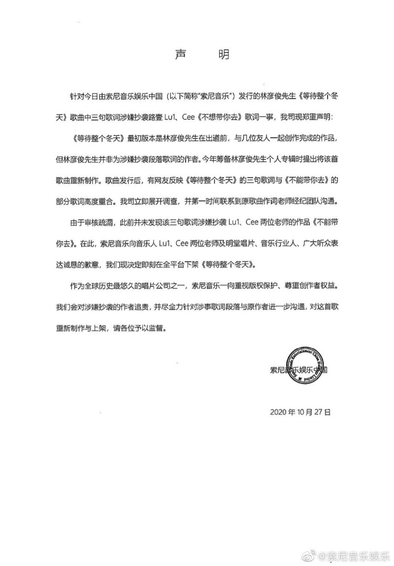 而林彥俊所屬的索尼音樂之後也發了聲明,而林彥俊也轉發該聲明,就新歌被指抄襲一事道歉:「在這首歌上發生這樣的事情,我非常的遺憾,也向對方作詞人表達誠懇的歉意,這是對原作者極大的不尊重,也不符合我的歌迷一直對這首歌的期待,為避免進一步對作詞人造成傷害,做出了立即下架的決定。再一次對所有涉事方表示歉意。」工作室也表示將重新制作該作品,並對涉嫌抄襲作者追責。