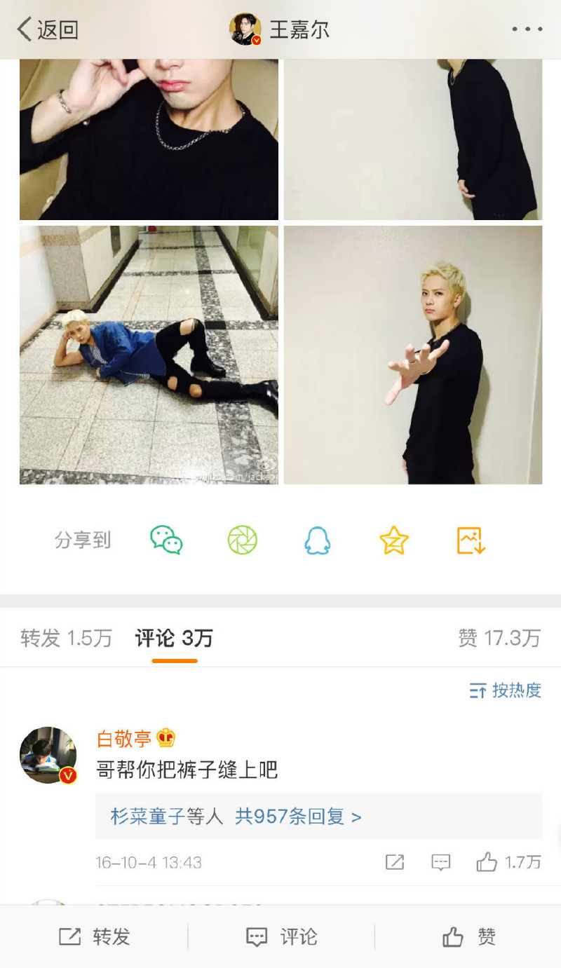 也有不少粉絲紛紛問小白,你這個王嘉爾媽粉變質了嗎?為什麼粉絲會這麼說呢?來看看~從前當王嘉爾show一點比較“露”的照片時,小白的反應是這樣!比如當王嘉爾穿著洞洞褲時…小白的留言是:「哥幫你把褲子縫上吧!」