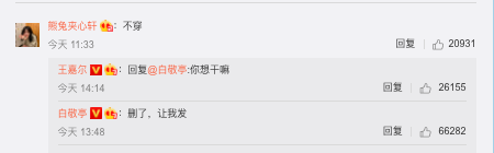 結果粉絲們清一色評論:「不穿」、「別穿了」等,熱評第一高達2萬個讚的留言寫道:「不穿」,結果沒想到王嘉爾的兄弟白敬亭,居然回復了這位粉絲,表示:「刪了,讓我發」哈哈哈哈!但更搞笑的是,王嘉爾居然回復小白,問到:「你想幹嘛?」
