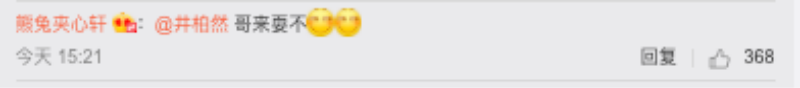 既然嘎嘎和小白玩得這麼不亦樂乎,粉絲自然不會忘記「兩百斤組合」的另一名成員井柏然,一堆艾特井柏然的留言出來啦!不是問他:「哥來(玩)耍不?」、再不然就是喊「井柏然快來管管你兩個弟弟吧!」表示井柏然躺著被cue啊!