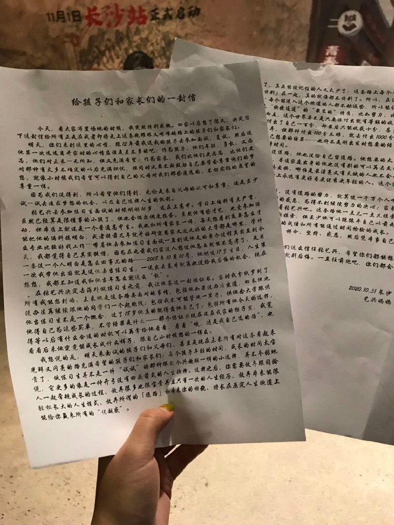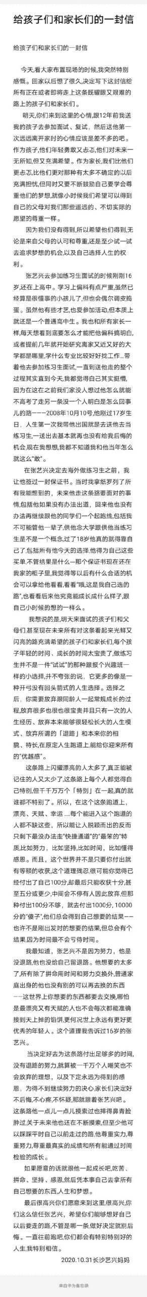 結果沒想到陸續有前往面試的選手,上傳了在招收現場收到的一封來自「張媽媽的信」,標題為「給孩子們和家長們的一封信」。