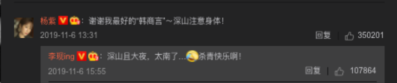 而小猴紫的回復是:「謝謝我最好的“韓商言”~深山注意身體!」