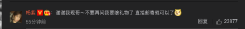 而楊紫今年的留言也不一樣了,表示:「謝謝我現哥,不要再問我要啥禮物了,直接郵寄就可以了。」哈哈哈哈~是噠!沒有了韓商言,今年是直接我現哥了!表示…感覺小猴紫已經被追問了好幾次想要什麼禮物了吧?