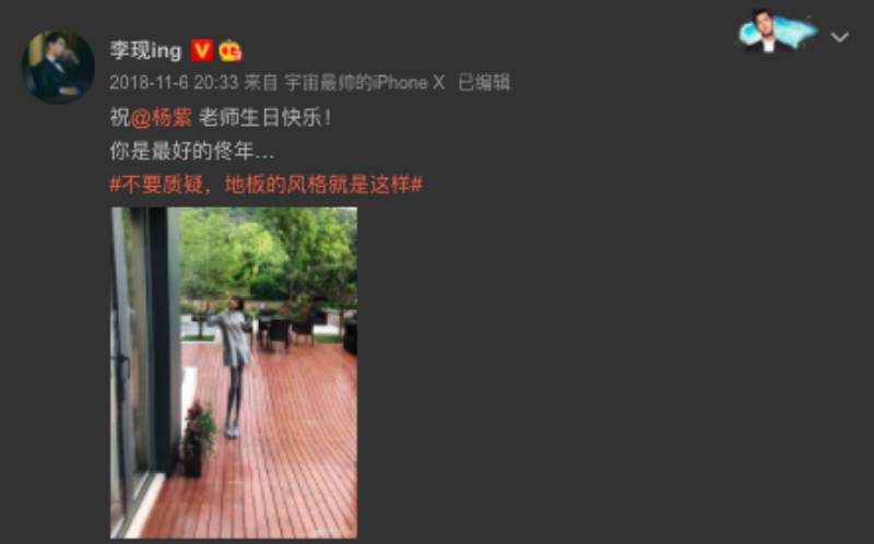 但這怎麼可能呢!首先…好友李現就肯定會送祝福啊!而且…這已經是李現第三年為我們的小猴紫送生日祝福啦!早在2018年,兩人在拍攝《親愛的,熱愛的》時,李現就發文祝楊紫生日快樂:「祝楊紫老師生日快樂!你是最好的佟年…#不要質疑,地板的風格就是這樣# ]