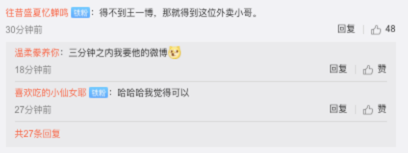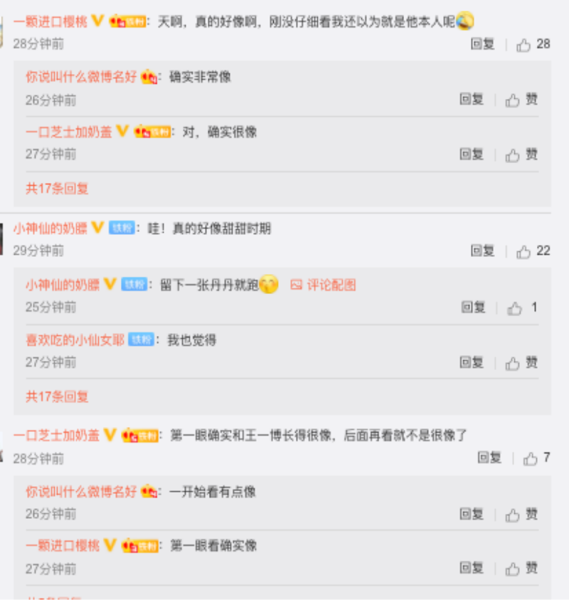 「天啊,真的好像啊,剛沒仔細看我還以為就是他本人呢!」、「確實非常像!」、「對,確實很像!」、「哇!真的好像甜甜時期!」、「留下一張丹丹就跑」、「我也覺得!」、「第一眼確實和王一博長得很像,後面再看就不是很像了!」、「一開始看有點像」、「第一眼看確實像!」、「如果真的是,那就太好了」、「這個外賣小哥真的長得太像王一博了吧,可能是藍騎士界顔值巅峰呢!」