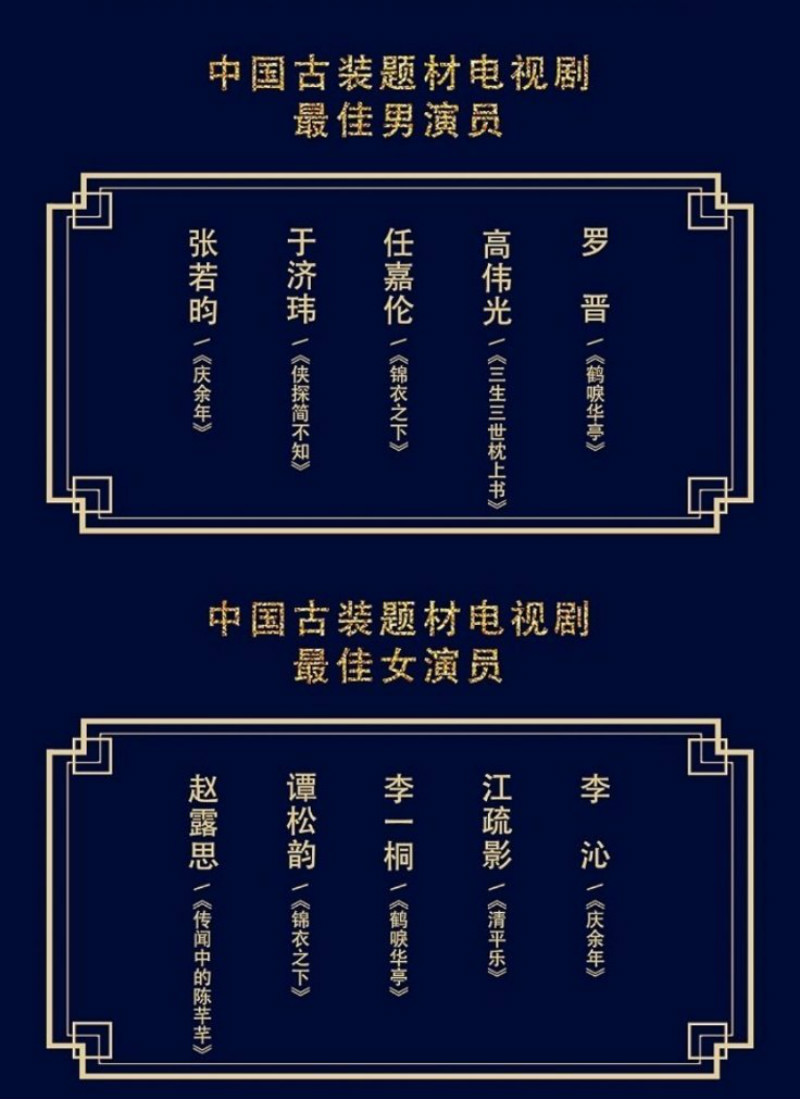 古裝題材電視劇最佳男女演員:張若昀、于濟瑋、任嘉倫、高偉光、羅晉、趙露思、譚松韻、李一桐、江疏影,李沁