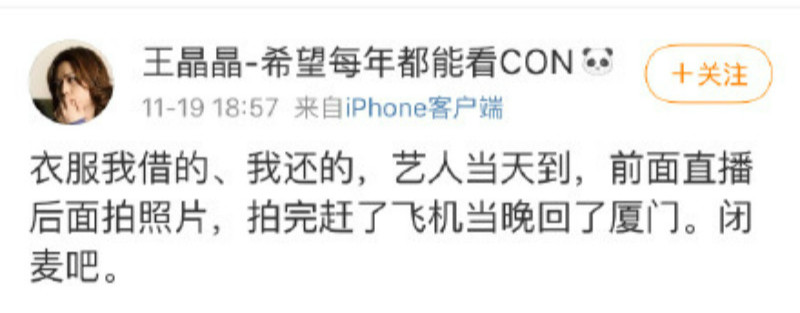 而張新成經紀人在傍晚時間也更新微博,表示:「衣服我借的、我還的,藝人當天到,前面直播後面拍照片,拍完趕了飛機當晚回了廈門。閉麥吧。 」