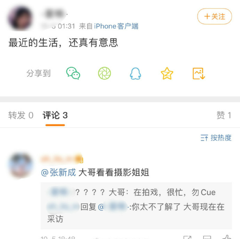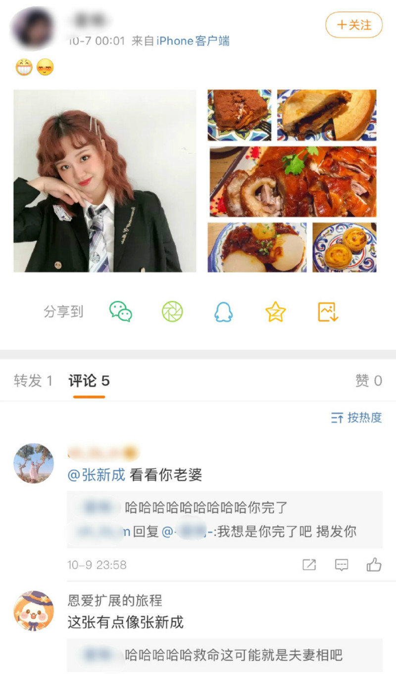 另外網友表示”嫂子“的朋友,每次都在其微博評論區直接艾特張新成,是兩人戀愛的證據(啊咧???)
